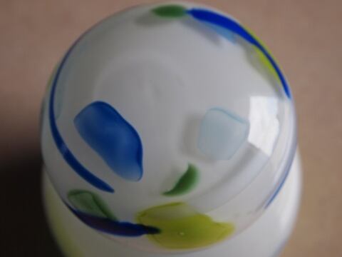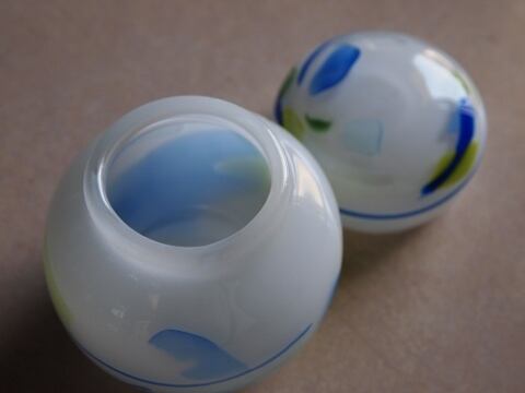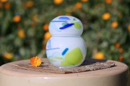幼子の二頭身を表現するため、いくつも蓋を作り合わせた結果出来あがりました。 作品番号:No.0004 作品名:手元供養ガラス骨壷(骨壺)[白の陽C3] サイズタ:タテ100mm×ヨコ90mm 容量:約大さじ12杯